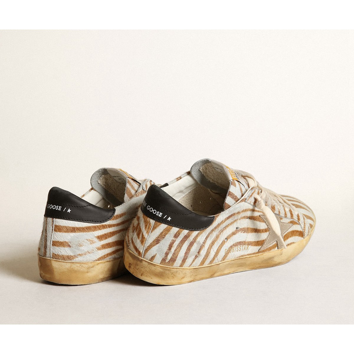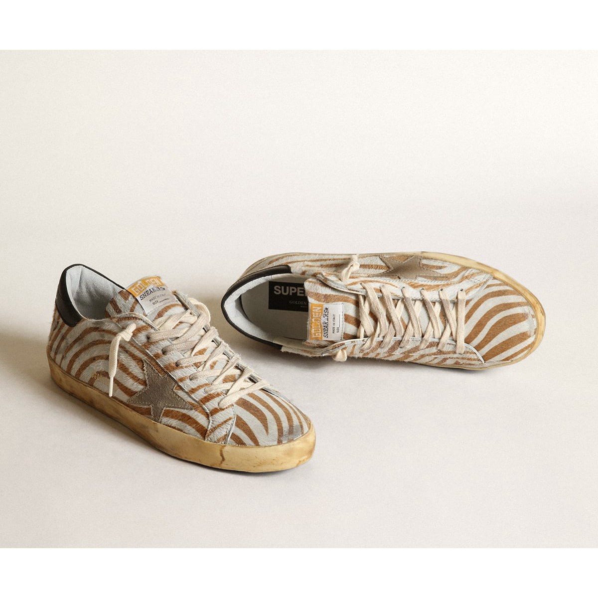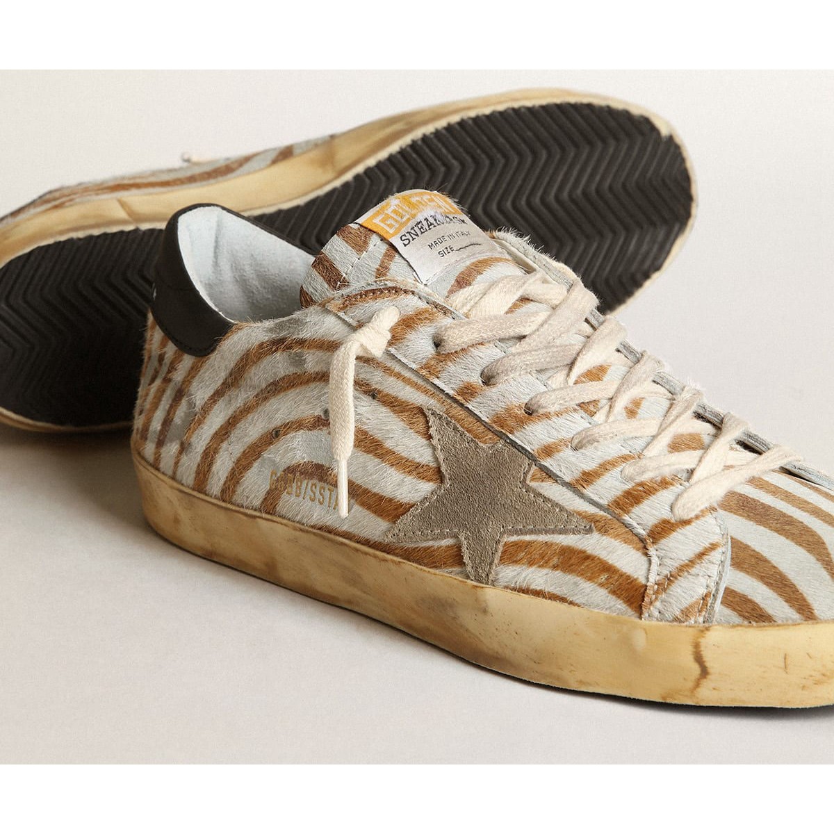 Un icono atemporal pero que está constantemente evolucionando. En Golden, nos encanta tomar nuestros clásicos y reelaborarlos todo el tiempo, siempre desde un nuevo ángulo. Este modelo para hombres, en la piel de pony con estampado de cebra en tonos de blanco y tabaco, presenta una estrella de gamuza gris de paloma y una pestaña de talón de cuero negro. Y los cordones de color crema agregan el toque final.